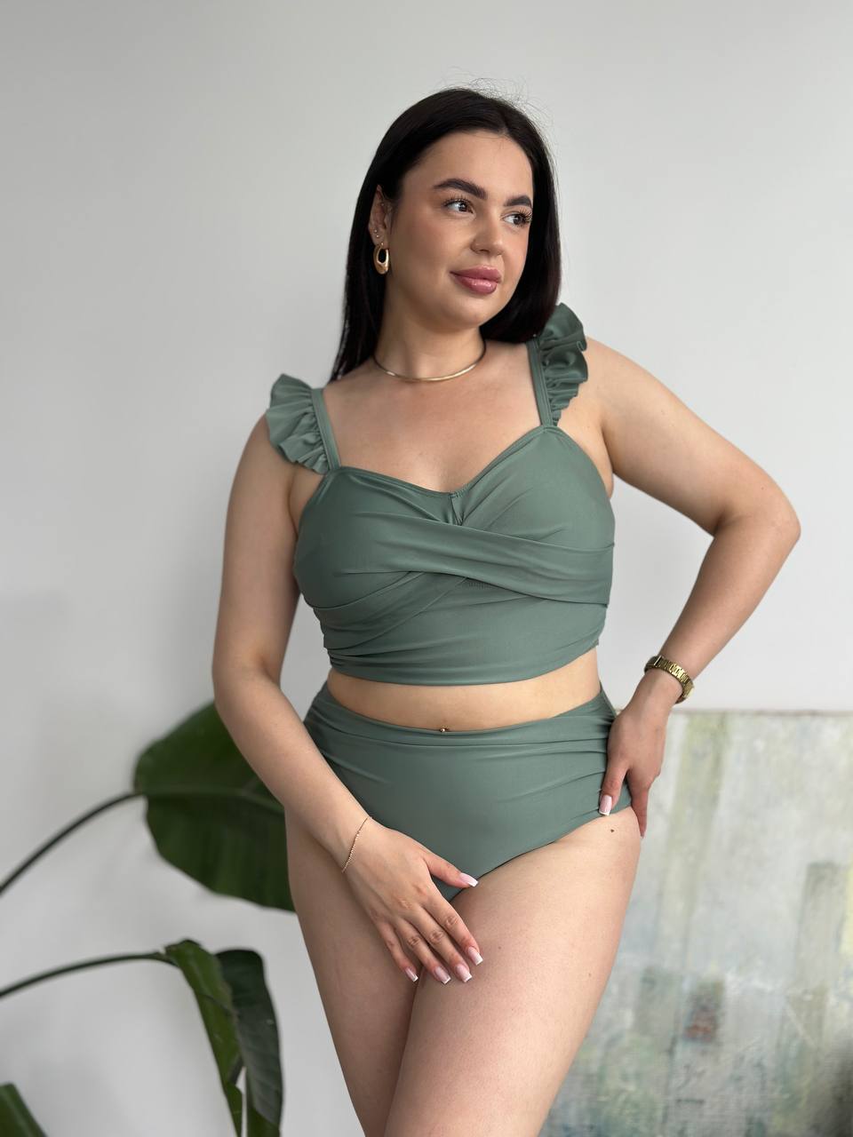 💚 Драпірований топ м’яко охоплює груди, створюючи ніжну лінію декольте